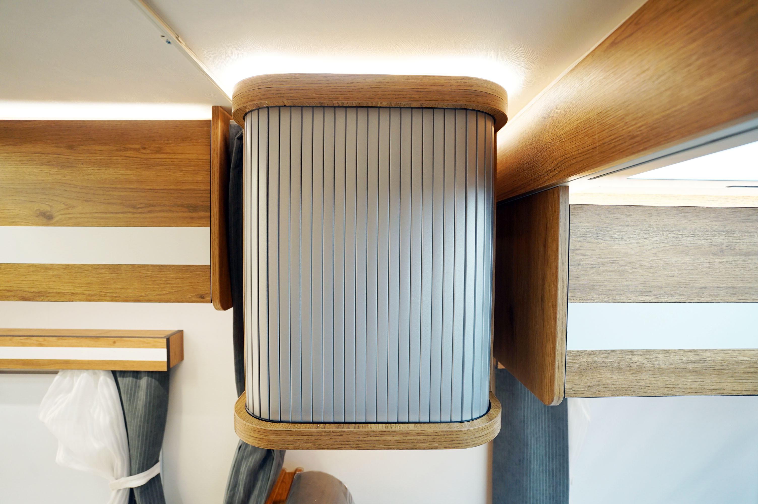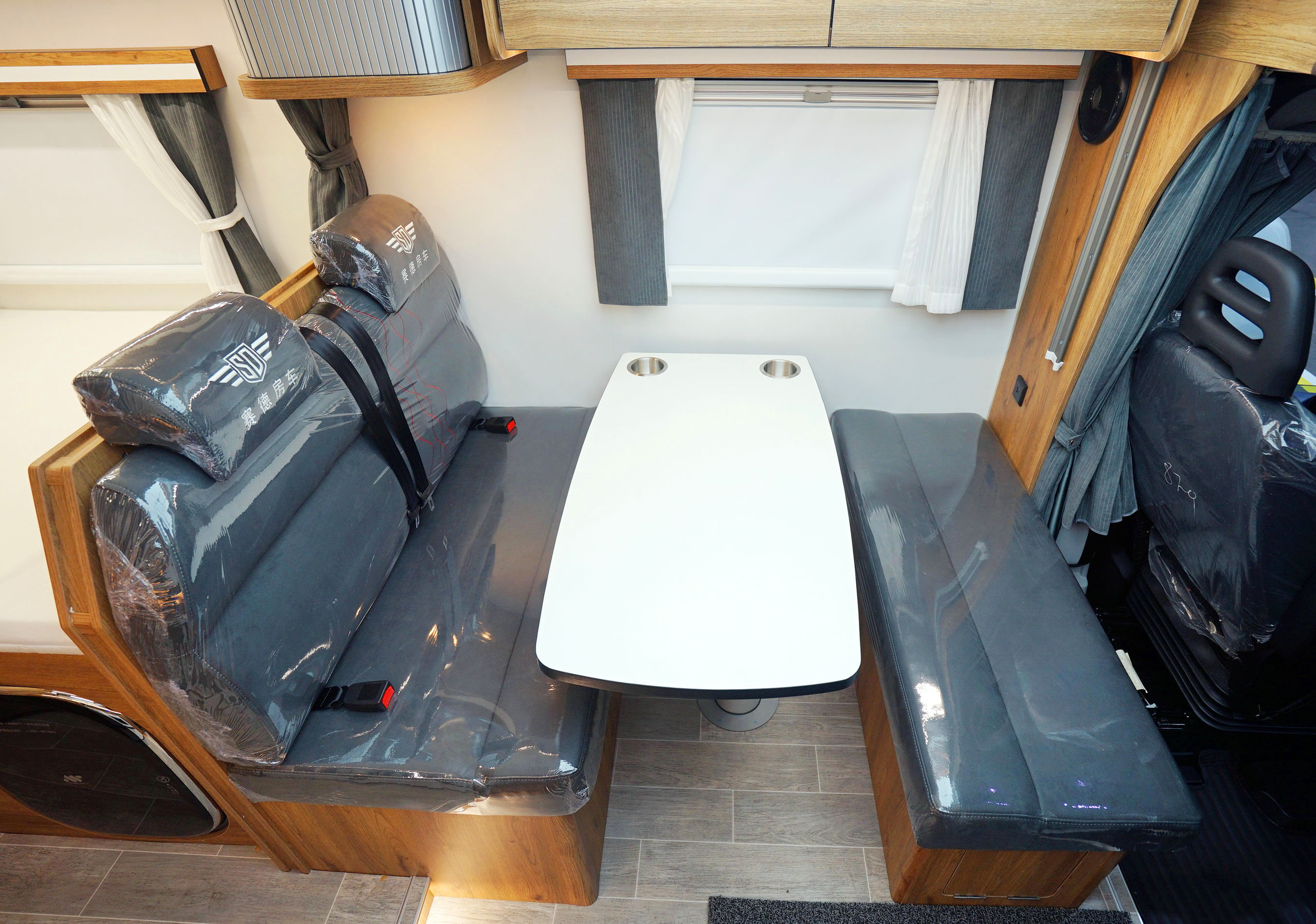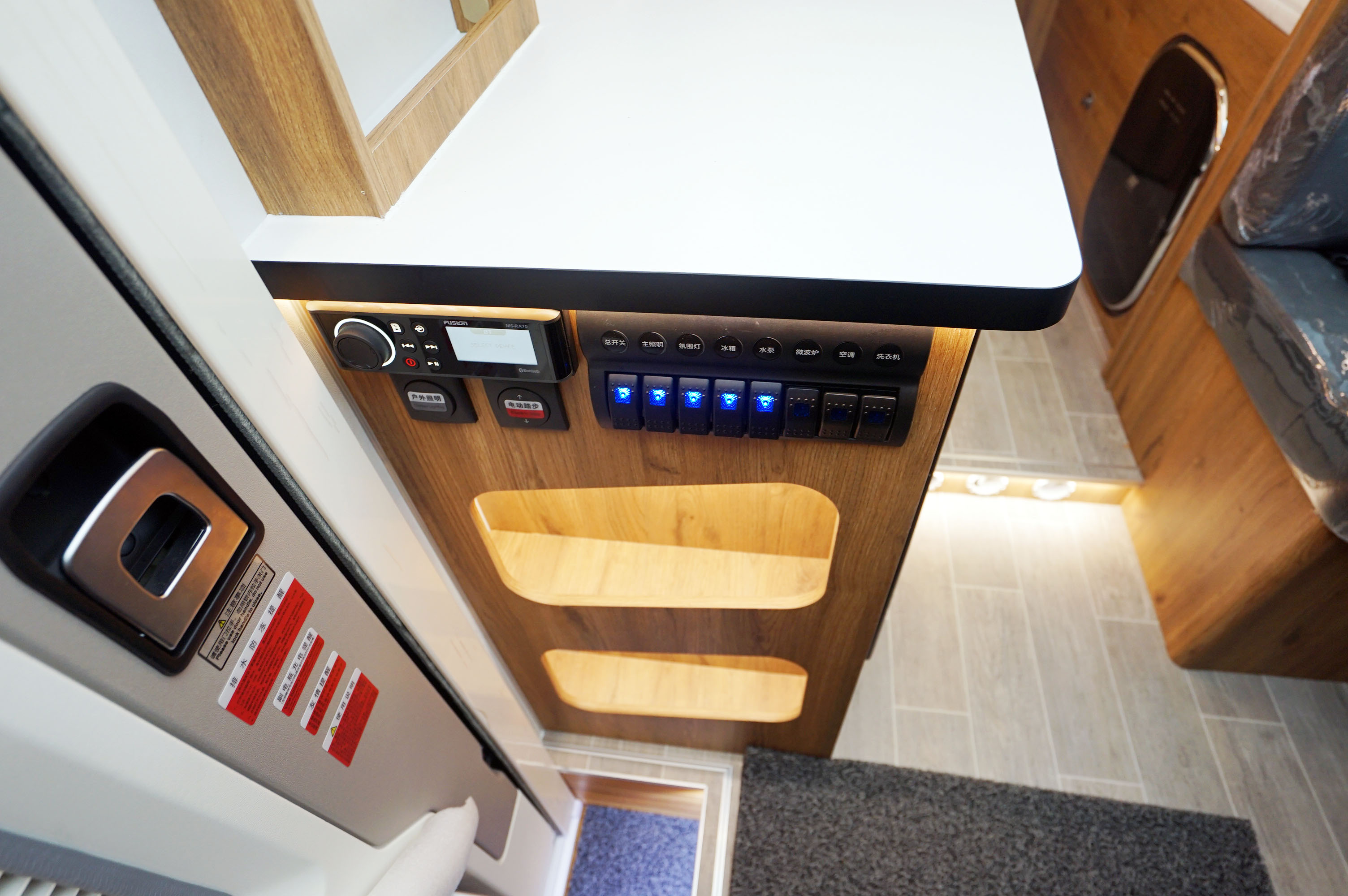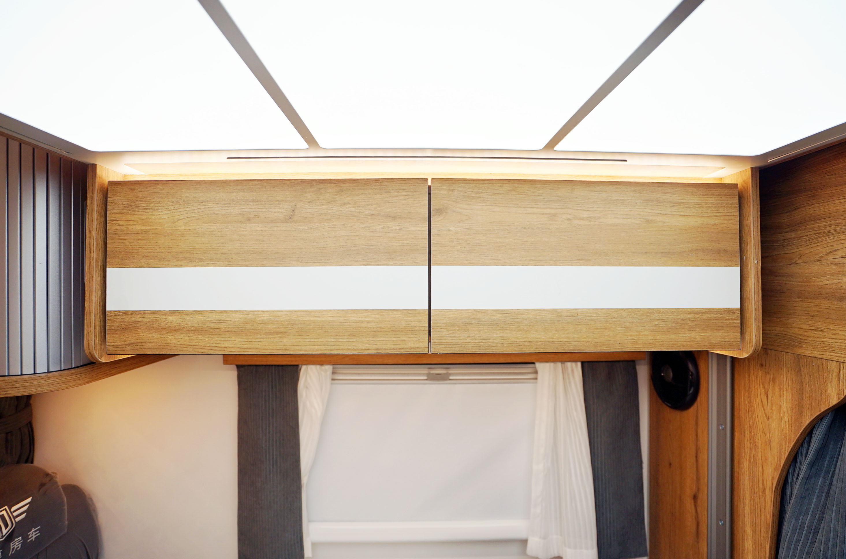 厨房区域的桌板是灰白黑拼色的肤感板材,不仅颜值很高,而且还非常耐脏。泰柚色板材搭配白色饰板,整车颜色完全符合欧洲设计师提出的简约的概念,全车色系不超过两种,看上去温馨舒适,搭配氛围灯,让整车的内饰部分看起来沉稳温馨。